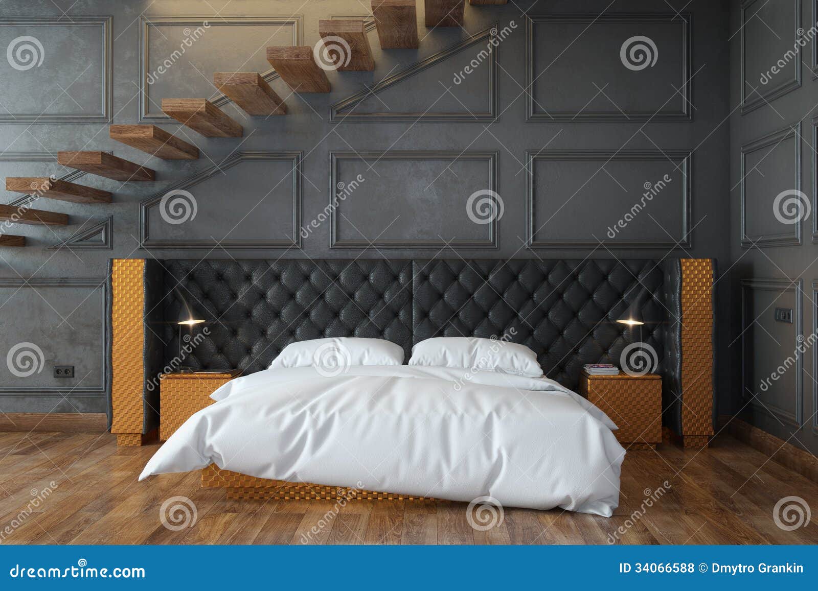 Black Bedroom Interior With Stairs Front View Stock Photo