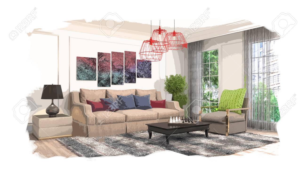 Interior Sketch Design Of Living Room 3d Stock Photo Picture And