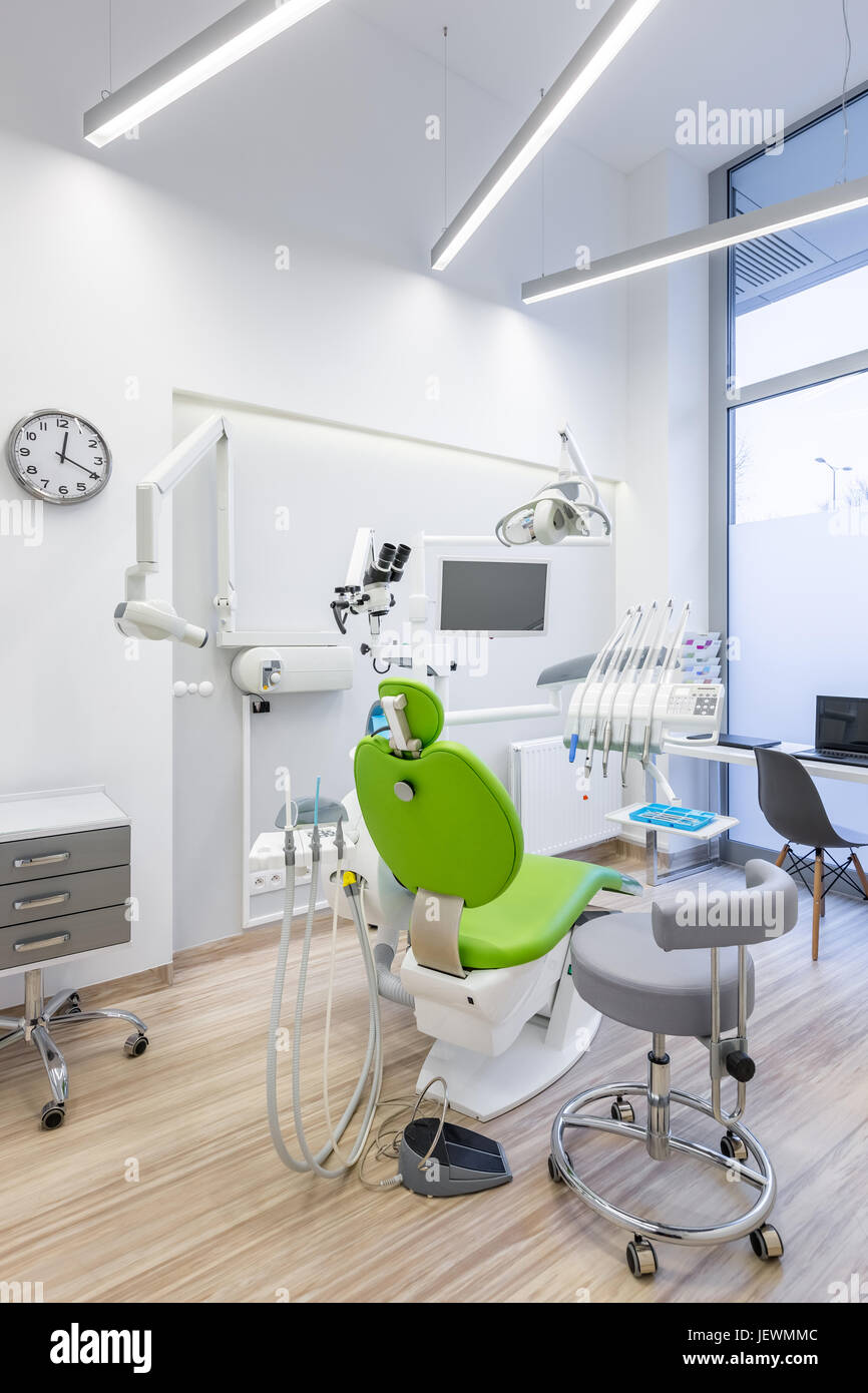 Dental Treatment Room With Modern Green Chair Stock Photo